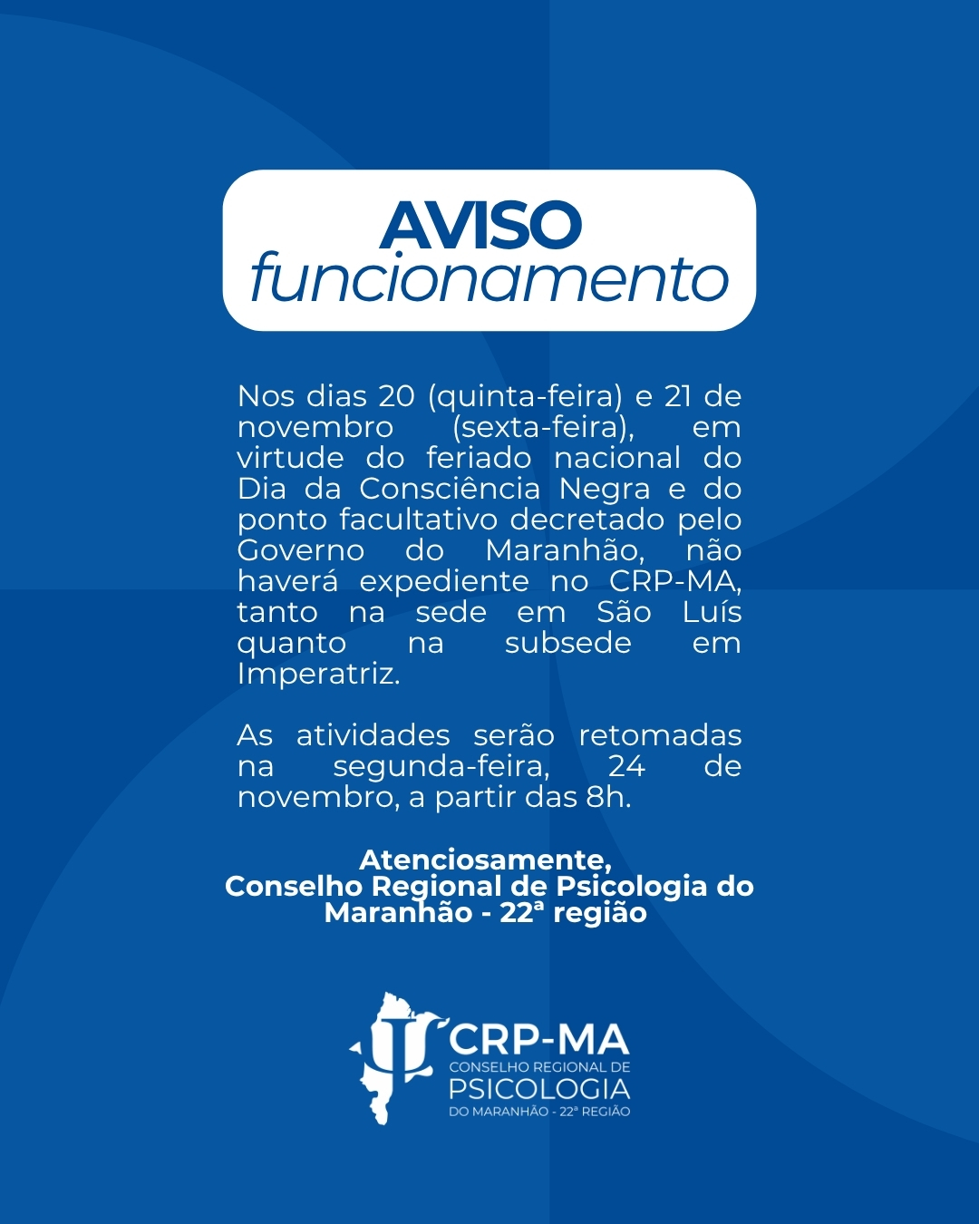 O Conselho Regional de Psicologia do Maranhão informa que, nos dias 20 (quinta-feira) e 21 de novembro (sexta-feira), não haverá...