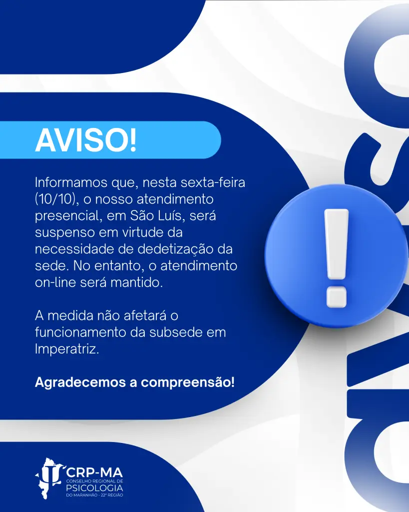 O Conselho Regional de Psicologia do Maranhão (CRP-MA) informa que, nesta sexta-feira, 10 de outubro, o atendimento presencial na sede, localizada na R. das Sucupiras, Quadra 56 – casa 24 – Jardim Renascença, em São Luís, será temporariamente suspenso devido à realização de procedimento de dedetização no local. A ação tem como objetivo garantir um […]